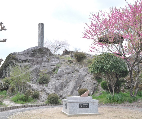 三村元範は、備中松山城主・三村元親(1517−1566)の弟で、永禄年間(1558−1570)にゆずりは城の城主となった。その後、毛利・宇喜多連合軍と三村勢との間で備中諸城をめぐって激戦が展開され、天正2年(1574)冬に同城も毛利軍によって攻められ、翌3年正月に落城した。元範は追っ手から落ち延びようとしたが、高尾石指の早乙女岩で毛利軍の多治部景春が率いる兵と戦闘になり、この地で討ち死にした。現在は、新見市立高尾小学校の敷地内になっており、頂上には大正14年(1925)に高尾地区住民により建てられた記念碑がある。