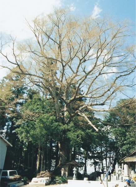 本ケヤキは、樹高約13m、目通り周囲6.9mあり、推定樹齢は約700年の巨木である。根元から約3mのところで大きな枝が2本を分岐し、さらにその上方では四方に枝張りを広げ、東西南北にそれぞれ約30mの延びを見せている。根元には荒神(こうじん)の小祠を祀っている。
