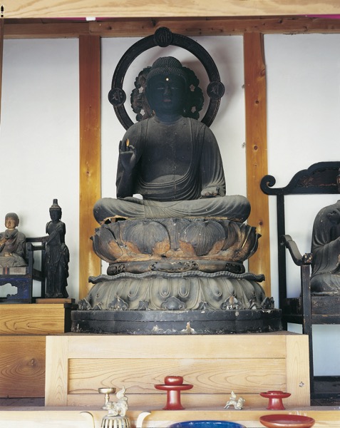 本像は、檜の寄木造(よせぎづくり)で、頭部は耳の前と後で3材を寄せ、体部はさらに正中線を矧(は)いでいる。両肩・膝部に別木を矧ぎつけ、腰部には三角材を置いている。もとは漆箔像(うるしはくぞう)であったと考えられる。総高136cm・像高88cmで、右肩から手首にかけては後補で、中指を欠損している。端麗(たんれい)で温和な表情をしており、14世紀以降の作と考えられる。
