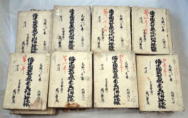 新見村検地帳(3冊)、馬塚村検地帳(1冊)、千屋村検地帳(1冊)、花見村検地帳(1冊)、佐根村検地帳(2冊)、井原村検地帳(1冊)、佐伏村検地帳(5冊)、赤馬村検地帳(4冊)、宇山村検地帳(2冊)、草間村検地帳(4冊)、土橋村検地帳(2冊)