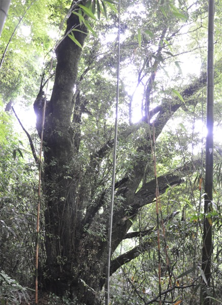 本アラカシは、樹高約26m、目通り周囲約5.2m、推定樹齢500−530年である。幹は、地上約5mのところから十数本に枝分かれをしている。アラカシとしては、県下第1位の大きさを誇っている。