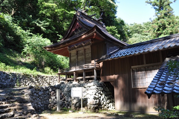 本殿は、平入(ひらいり)、三間社(さんげんしゃ)で入母屋造(いりもやづくり)、檜皮葺(ひわだぶき)である。屋根は大棟に2組の千木(ちぎ)と3本の堅魚木(かつおぎ)を置き、拝みに鰭付蕪懸魚(ひれつきかぶらげぎょ)を吊るしてある。妻梁(つまばり)は二重で大瓶束(たいへいづか)によって棟木(むなぎ)が支えられている。軒は一軒繋椽(ひとのきしげたるき)で、組物(くみもの)は平三斗(ひらみつと)、各柱間には蟇股(かえるまた)を飾ってある。平三斗は舟肘木(ふなひじき)を使用しないで通肘木(とおしひじき)で支え、その上に軒桁(のきげた)を乗せてある。頭貫(かしらぬき)、大斗三斗、通肘木、軒桁は彩色されており、木鼻(きばな)、頭貫は彫刻されている。身舎(もや)は、正面310cm、側面291cm、主柱は径16cmである。入母屋造、檜皮葺で向背のない屋根形態は神社の本殿としては全国的に少なく古い形態とされる。また基壇(きだん)を作らず、石敷とした床下の工法は古式のものである。平成18年10月から平成19年7月末に修復工事を行った。